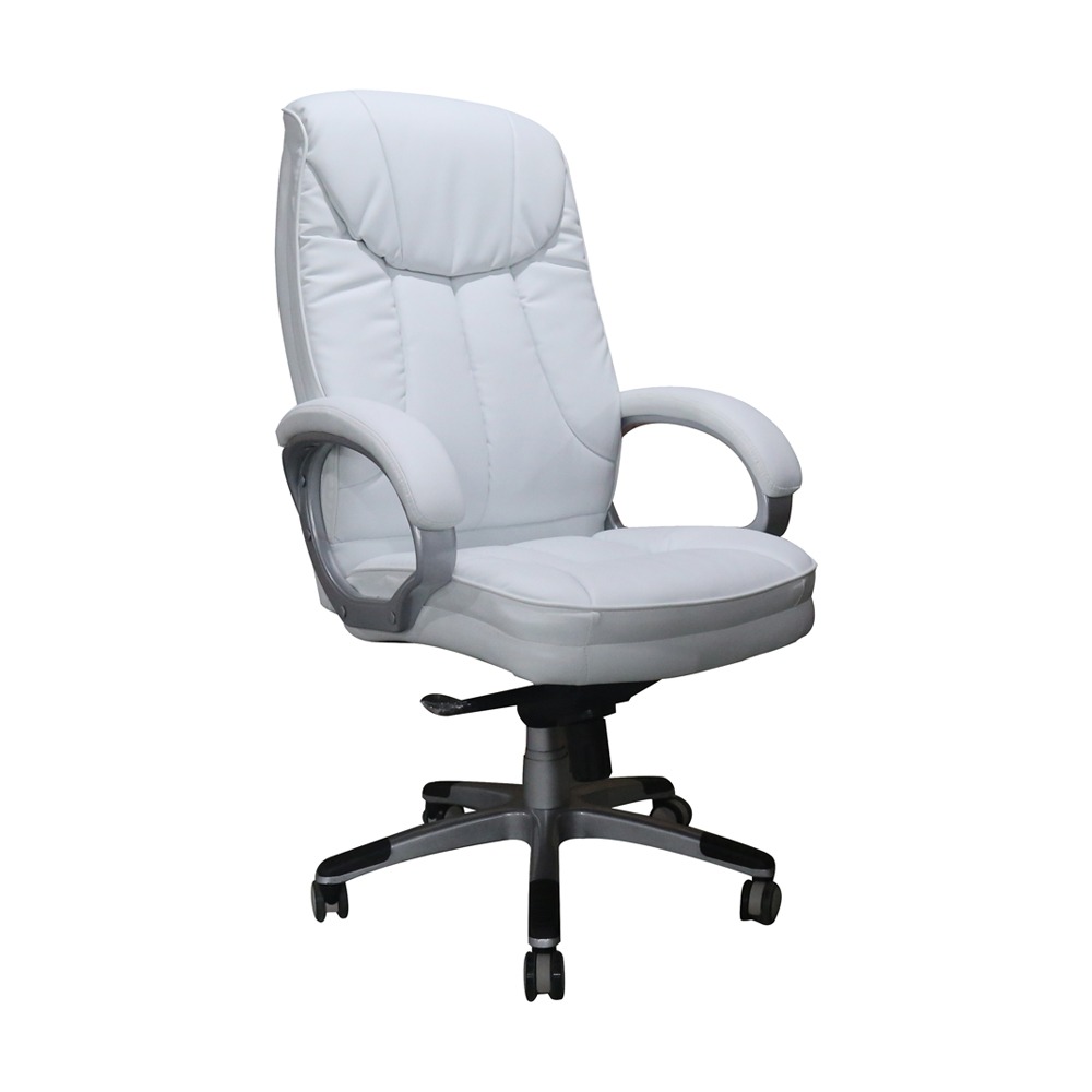 העיצוב האלגנטי של כסא מנהלים דגם סאב גבוה דמוי עור כולל בסיס מתכת בצבע כסף עם חמישה זרועות חזקות וגלגלים כפולים לניידות חלקה.